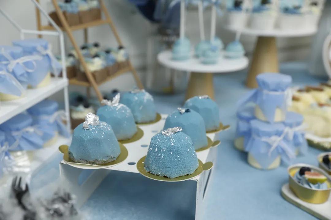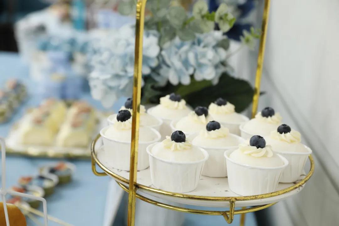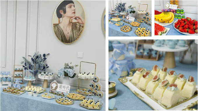 美味的蛋糕、琳瑯滿目的水果和飲品被陳列在桌面上,令人垂涎欲滴。